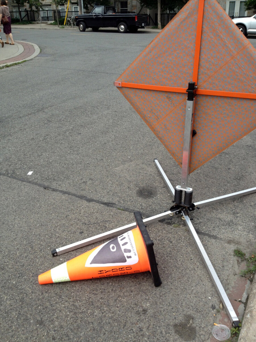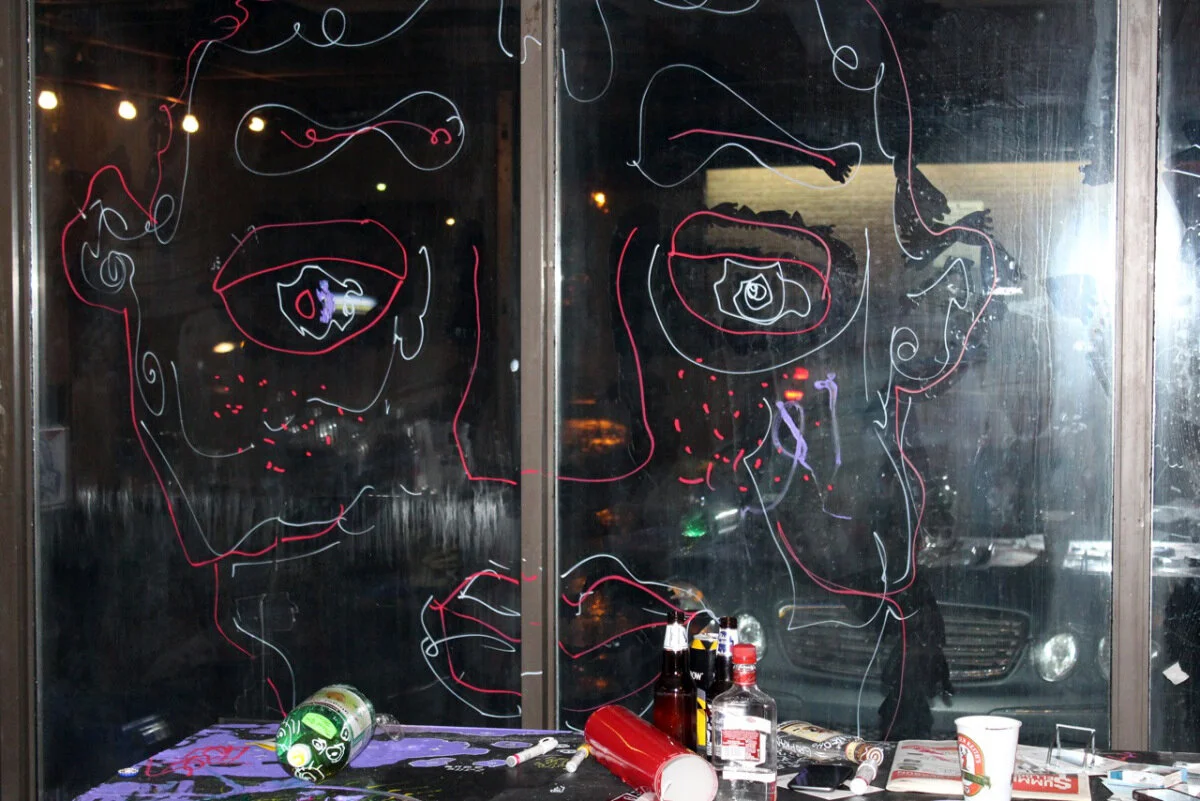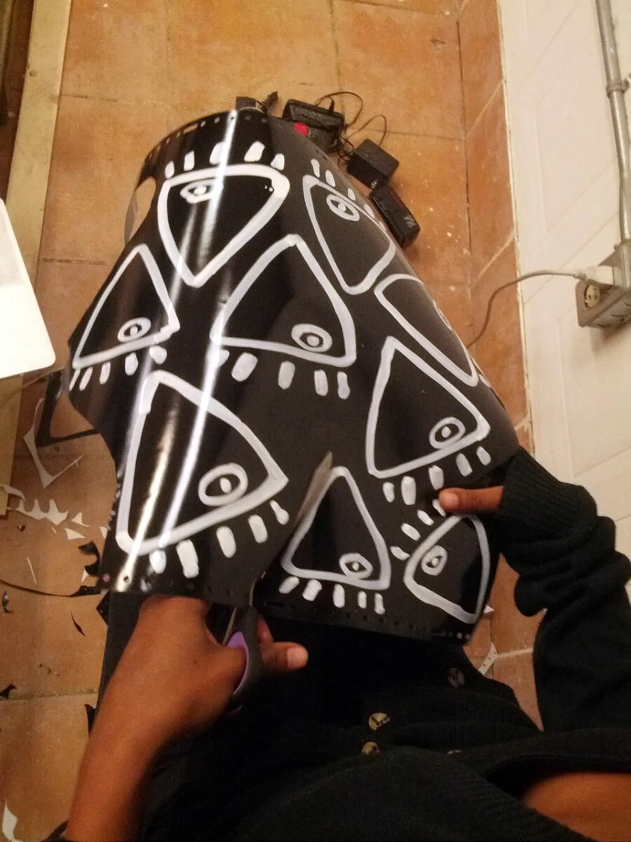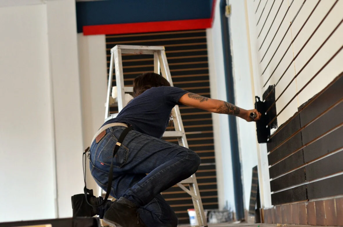 artist Ashton Shearer cutting out some of the over 2000 hand-drawn, vinyl triangles used to create window mural