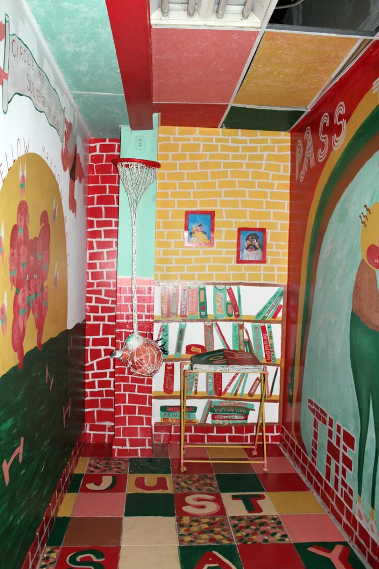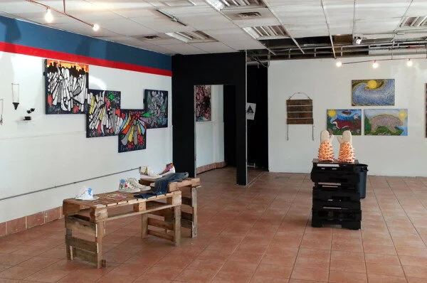 designers Mia Solomon and Amy Markanda installing custom-made gallery lighting